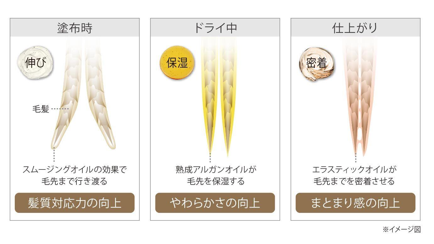 スムージングオイル※1、熟成アルガンオイル※2、エラスティックオイル※3の3種のオイルを配合。髪につけたとき、スムージングオイルが広がり、ドライ中は、熟成アルガンオイルが保湿。仕上がり時には、エラスティックオイルが毛先まで密着し、まとまり感を向上させます。